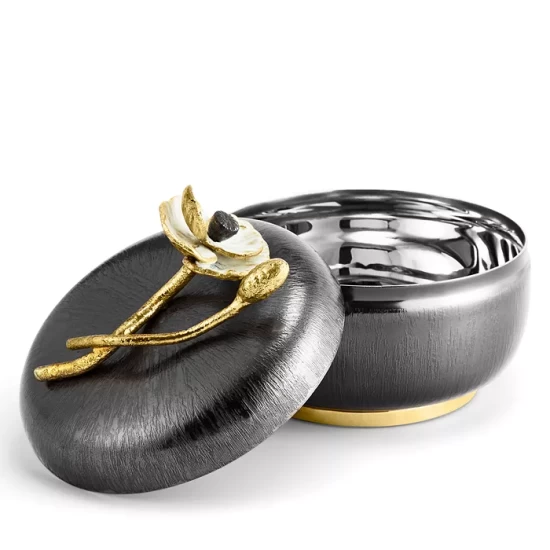 - Hand-textured stainless steel/black nickelplate/natural and oxidized brass/white enamel
