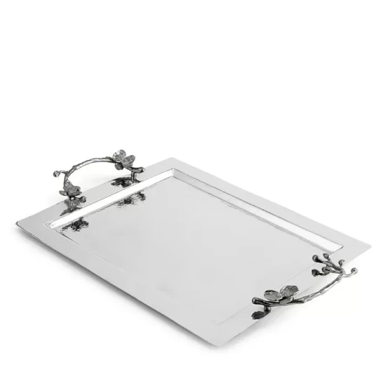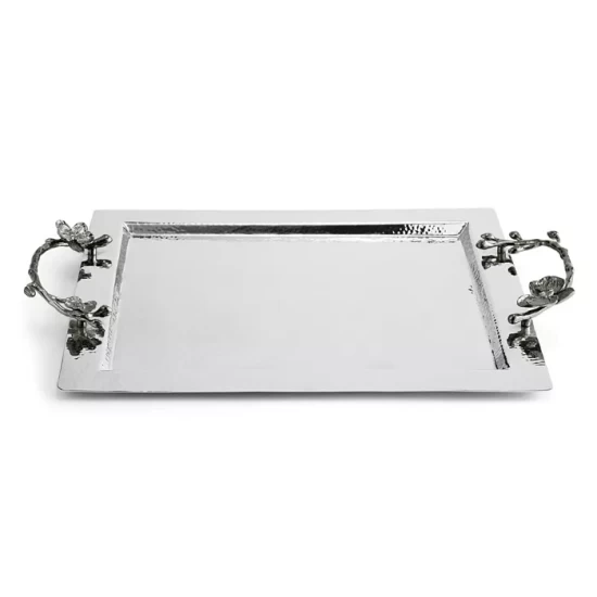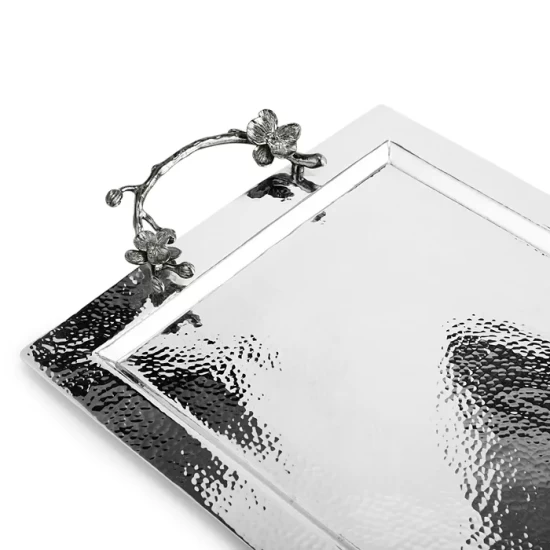 A bright nickelplate finish enliven’s Michael Aram’s sculptural botanical-influenced collection. Each piece is decorated with blooming orchid designs rendered in fine, delicate detail.
