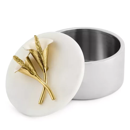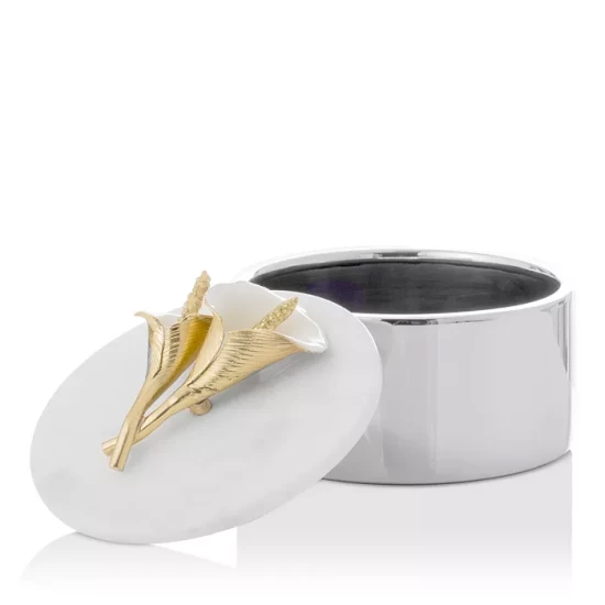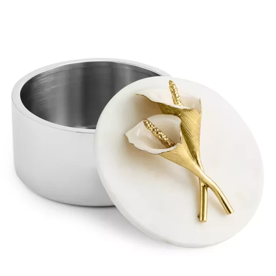 - Lidded box finished with a calla lily accent