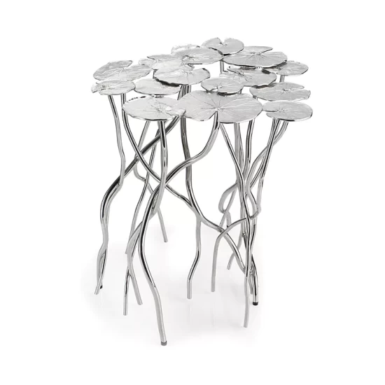 Michael Aram’s lily pad side table is inspired by the elegant shape and spiritual symbolism of the floating flower.