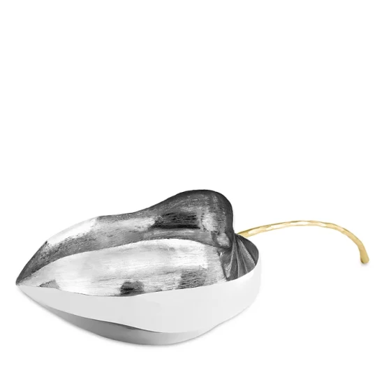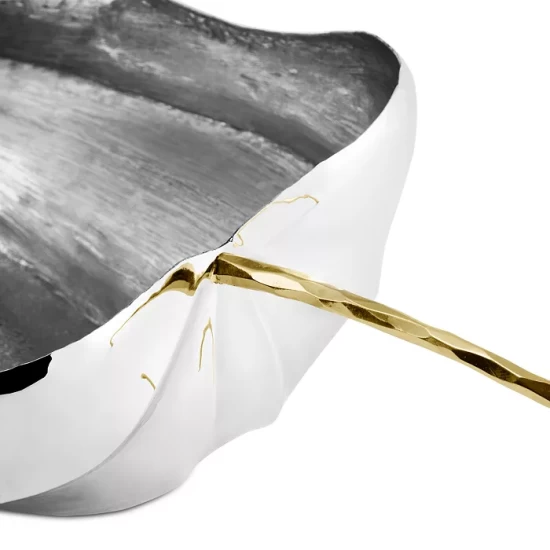 - The hand-textured, stainless steel leaf bowl is etched in contrasting patterns, while the forged brass stem speaks to Michael’s love of mixed metals.