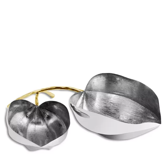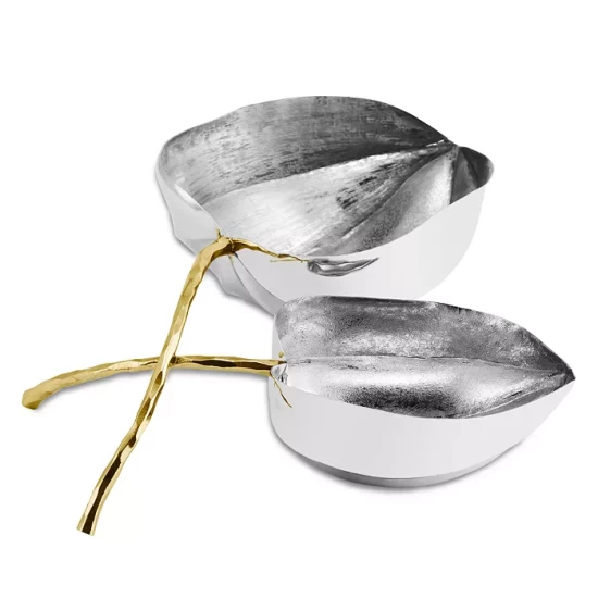 - Hand-textured, stainless steel leaf bowls are etched in contrasting patterns, while the forged brass stems speak to Michael’s love of mixed metals.