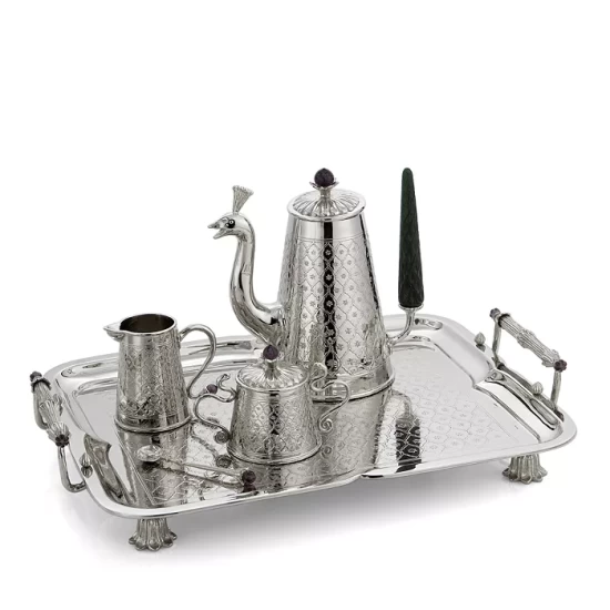 - Set includes: tray with handles, tea pot, creamer, sugar pot and spoon
