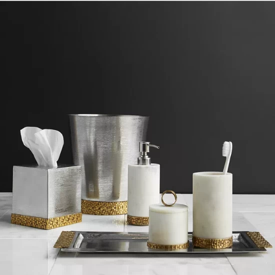 Inspired by the natural beauty of palm fronds, the Palm bath accessories collection by Michael Aram pairs luxurious, sleek marble and stainless steel with sculpted antique gold-tone accents.