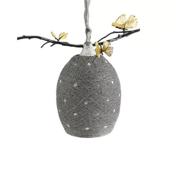 In crafting this nature-inspired pendant lamp, Michael Aram imagined a cocoon that had just fallen off the tree with a golden butterfly within.