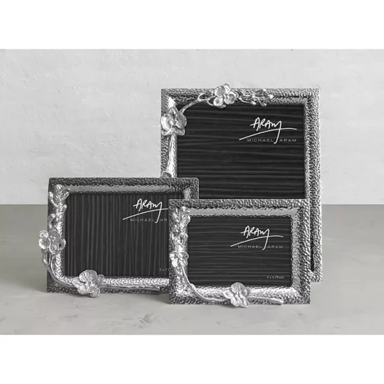 A bright nickelplate finish enliven’s Michael Aram’s sculptural botanical frame. Each piece is decorated with blooming orchid designs rendered in fine, delicate detail.